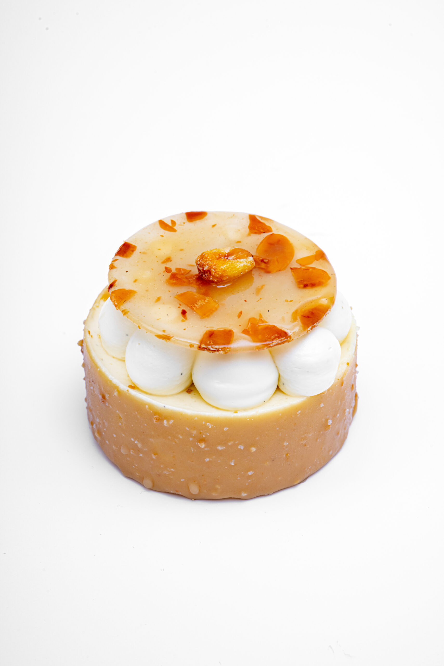 Biscuit moelleux à la farine de maïs, Praliné amande et maïs grillé, Bavaroise vanille et Ganache montée au maïs grillé