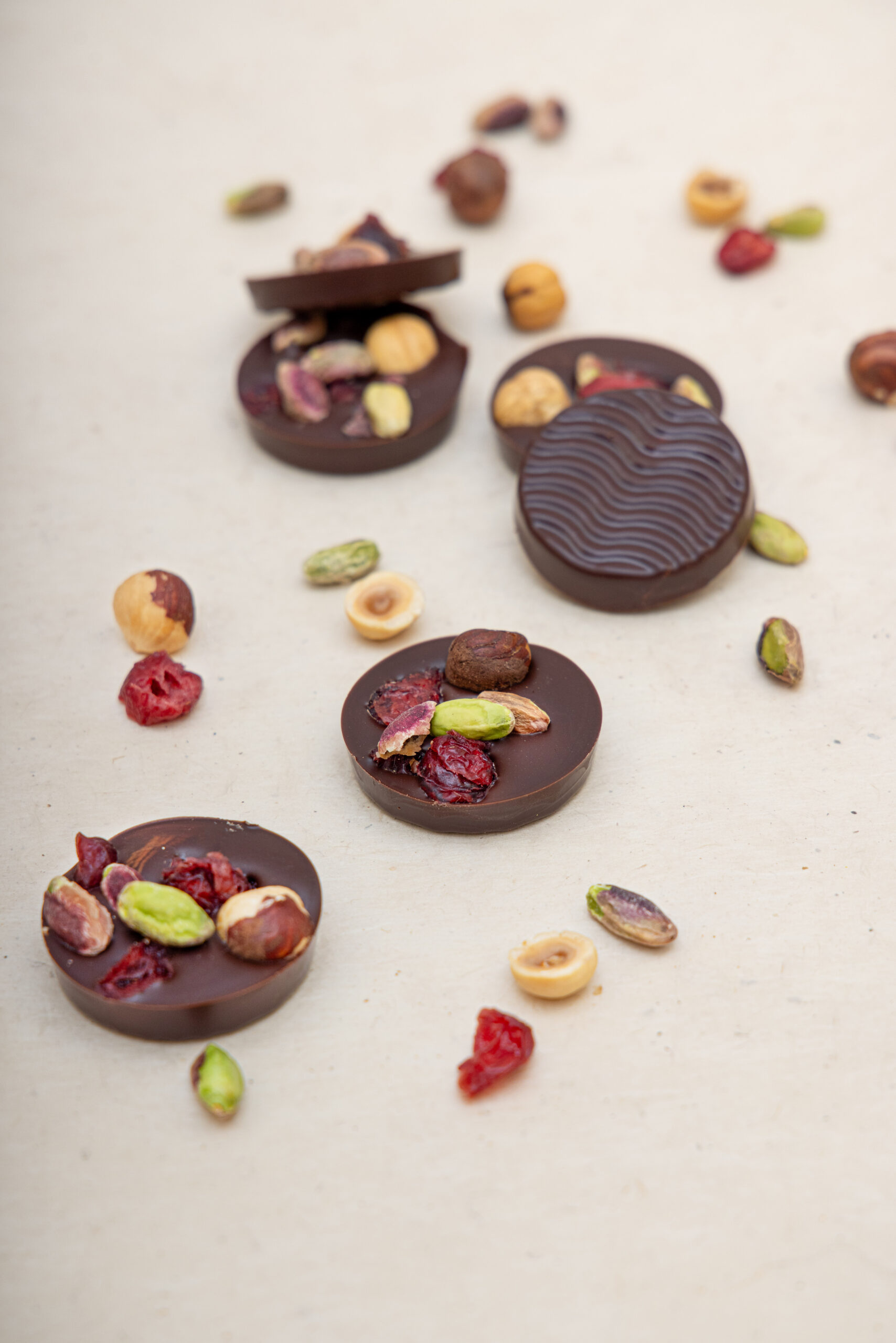 Chocolat Noir (sucre, fèves de cacao, beurre de cacao, lécithine de tournesol, extrait de vanille),